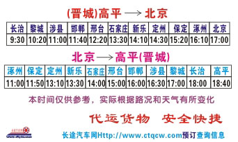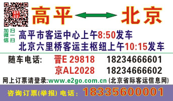 高平到北京客運班車,高平市客運中心上午8:50發(fā)車,北京六里橋客運主樞紐上午10:15發(fā)車,車號:晉E29818,隨車電話:18234666601,車號:京AL2028,隨車電話:18234666602。咨詢訂票(舉報) 電話:18335600001,網(wǎng)上訂票請登錄:www.e2go.com.cn (北京省際客運信息網(wǎng)) ,詳細途經(jīng)地點及時間見名片信息,長途汽車網(wǎng)提供更多隨車電話號碼查詢。