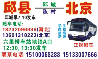 邱縣到北京客運(yùn)班車,正規(guī)班車,全程高速,免費(fèi)接送,邱城早上7:10發(fā)車,隨車電話:18232096999(河北);13601218223(北京),六里橋車站地鐵A口12:30,13:30發(fā)車,聯(lián)系電話:15100068288,15133007666,新發(fā)地長途汽車站下午2:00發(fā)車。長途汽車網(wǎng)提供更多隨車電話號碼查詢。