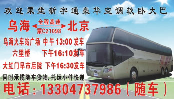 烏海到北京客運(yùn)班車,本班車為新宇通豪華空調(diào)軟臥大巴,全程高速,烏?;疖囌緩V場中午13:00發(fā)車,六里橋車站下午16:10發(fā)車,大紅門早市后院下午16:30發(fā)車,車號(hào)為蒙C21098,隨車電話13304737986,歡迎乘坐!!長途汽車網(wǎng)提供更多隨車電話號(hào)碼查詢